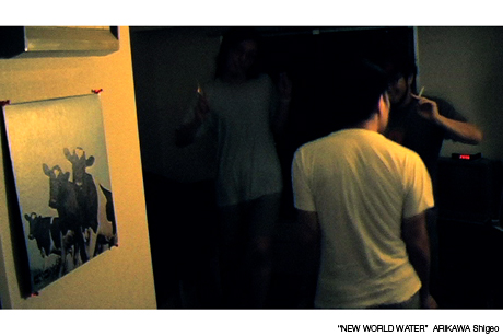カメラの前においては、純粋たるドキュメンタリーも、純粋たるフィクションも、ありえないということはもはや疑いようもありません。となると、わたしにとって"NEW WORLD WATER"で興味深いのは二つのシーンです。一つは、家族が食卓を囲んでいる一連のシーンで、もう一つは、薄暗い部屋の中を三人の男たちが踊っているシーンです。これらは、とてもフィクショナルなものに見えますが、パンをかじる姿を撮影しているカメラがあったことを、わたし以外の家族は知りませんでしたし、ひどく酔っぱらった三人の男たちは、カメラが置いてあることを忘れ、飛び跳ねている最中に三脚を倒してしまったのです。わたしたちの無意識の連続した動作のなかに、突如現れる意識的な"振る舞い"こそ、(しかし、この"振る舞い"は常に無意識の動作に回収されるのです。)"演技"の始まりであり、カメラの再現性はそれを誇張して提示します。
