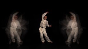 齋藤: コンピュータによる編集は2005、6年くらいまでやっていたのですけれども、自分の生活環境が変わったタイミング、働きだしたことで常にカメラを持っているわけにもいかなくなって日常的なスナップが撮りにくくなった時に、自動編集から一度離れてみようと思いました。ちょうど2006年頃に、やっとHD(ハイディフィニション・フォーマット)で制作できる環境になってきたということがあり、その時の興味としては「ブレ・ボケに対する鮮明な画像」といったことに加えて「インスタレーションにした時にも画質が保てる」ということがありました。元々、これはインスタレーション作品でして、映像インスタレーションに興味が段々と移っていく時期の作品です。実際、どのように撮影しているかといいますと、真ん中に踊っている方がいて左右にそれがボケた映像があるシーンを例にしますと、実際に収録する時には、ダンサーの方にそのボケた映像(自身の動きの軌跡)をリアルタイムで見ていただいています。つまり、「自分自身とダンスを踊る」といった環境を用意したわけです。というのは、岩下さんは即興で踊られる方で、何か周りの状況に対して動きを紡いでいくという踊り方をされる人なので、その環境としてそういうものを用意して撮影を試みました。