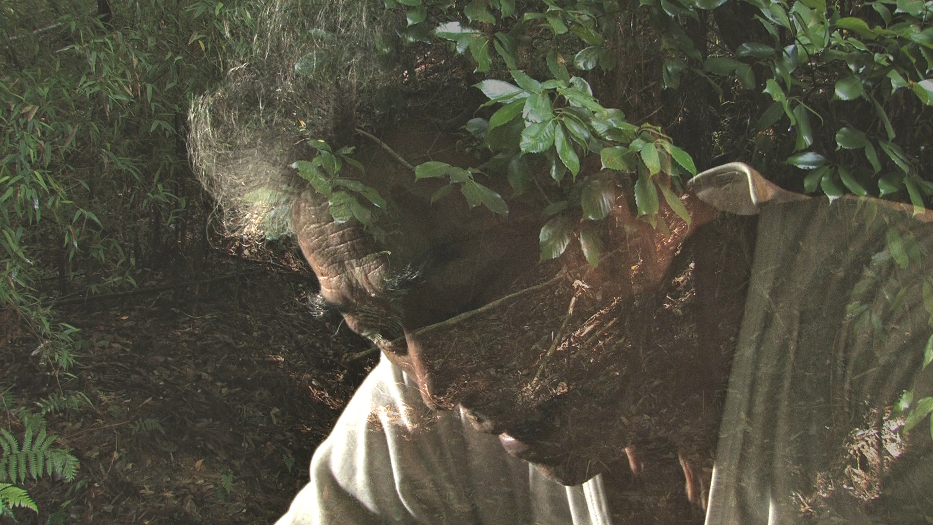 松井: なにかいろいろな場所に前半と後半、あるいは全体と部分の構造が入り組んでいます。最後の方で、洞窟から出てきた青年(音楽家の福島諭)が声を出すシーンがありますけど、これは池田さんの最初期の作品で、DVDに収録されている『7×7』(2004年)の引用というか再演、反復ですよね。『7×7』では、その青年の後ろを轟音で貨物列車が走って声がかき消されるという非常に印象的なシーンでしたが、今回は対照的に静寂というか、森の中です。